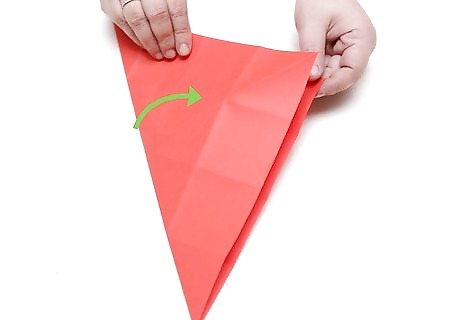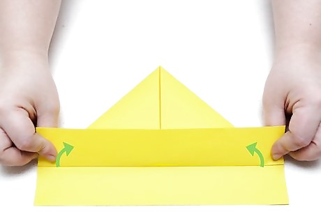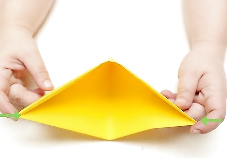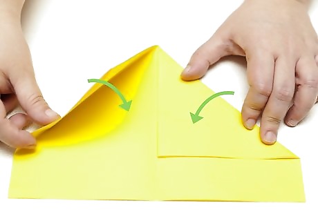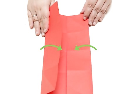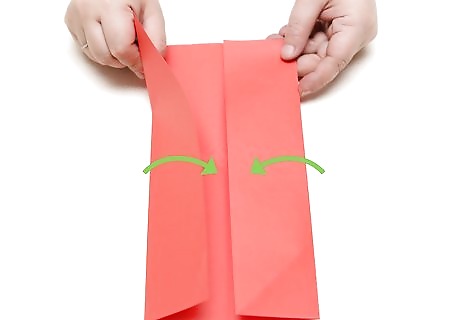 Fold the corners into the center. Once you have folded your paper in half, reach for the top corners (facing horizontally) and pull them towards the center. This should result in two triangles meeting in the center, with a strip of uncovered paper at the bottom. If you're having difficulty finding the center, make sure the corners are lining up evenly. If you're still having trouble, try measuring the paper with a ruler and draw a thin pencil line down the middle. This will give you a target to aim for.
