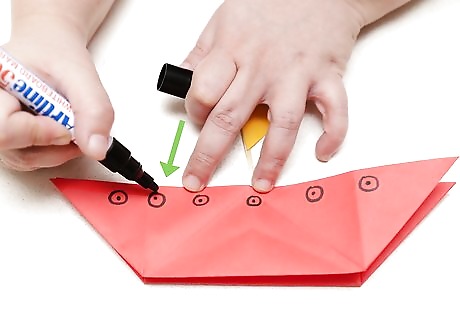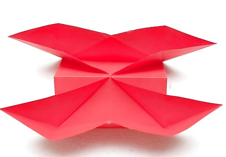 Make two inside reverse folds. This is where your boat will begin to take form. Turn the paper over on its opposing face. Push the corners upward to make an upside-down pyramid. When you have accomplished this, take each of the four corners and fold them down. Turn the boat over when you have completed these folds. It's now ready for decorating. When you have completed your inside reverse folds, you should have a square pyramid shape in the centre, with four arms jutting horizontally from the pyramid's corners. The inside reverse fold is a potentially tricky fold to master in origami. It's worthwhile to figure out the individual fold before you move on with it in practice.
