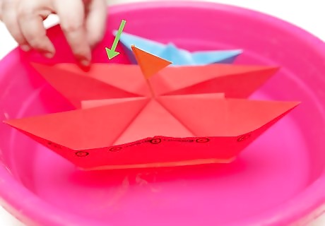 Launch it into the water. Although some boat builders may prefer to keep their boats as purely ornamental crafts, a paper boat with its bottom flaps opened will float on water for a time. If you want, you can fill up your bathtub and see how long yours remains afloat for. Taking your craft to a river or park lake will arguably make for a better photo op. If you like competition, you and a friend should make your own boats. Place them in the water at the same time and see which one stays afloat the longest! If you place your boat in the water, chances are it won't be saved for a second use. Luckily, craft boats are very easy to make, so you won't have to worry much if they're lost at sea.