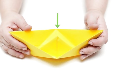 Set your boat upright. Once you have completed the folds and opened it up, it's time to see how your boat has fared. Upright, the boat should take the form of a long pyramid, with a triangle tip (or sail) poking out from the top. Although it's not quite a battleship yet, with the folds all done, you'll be set to decorate it as you please.