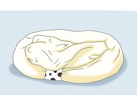 Put a bed in the playroom so that your dog has somewhere to sleep. Dogs spend a lot of time sleeping, so it’s important that your dog has a cuddly place to nap while you're away! Choose a soft, comfortable, semi-enclosed or couch-style bed for your dog to curl up on. You can also add a few blankets or a pillow to the bed to make it even more snuggly.