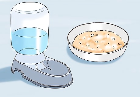 Provide fresh food and water for your dog in the playroom. Your dog needs access to fresh food and clean water while it's in the playroom. Get large plastic, stainless steel, or ceramic bowls. Make sure that the water is topped up and available at all times. You only need to provide food in the playroom if your dog is in there during its regular mealtime. If you have carpet and are concerned about food or water spilling, place the bowls on an old towel or on a water-resistant mat. It's best to place the food and water bowls away from your dog's bed to avoid the bedding getting messy.