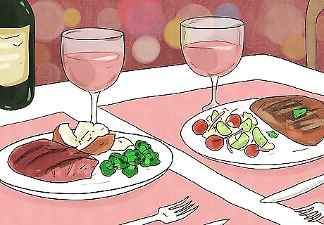 Go to a romantic dinner. There are few things as romantic as a candlelit dinner with you and your loved one at a nice restaurant you both enjoy. This may be something worth splurging on if you are in the mood to do so. Choose an upscale restaurant and treat your beloved to a wonderful dinner. If you are willing to pay extra, some restaurants will allow you to have a customized menu for special occasions, such as anniversaries. Call the restaurant ahead of time to find out if they will allow you to do so and how much they charge. It usually requires printing an extra menu or two with your names or a message written at the top.
