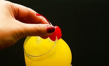 Use a knife and cut a slit in the cherry. Wedge the cherry on the side of the glass as a garnish.