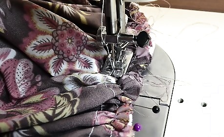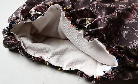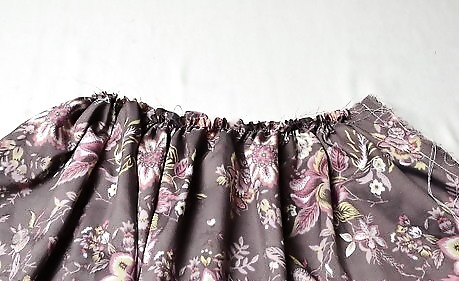 Pull on the bobbin threads to gather them. The bobbin threads will be on the back side of your fabric. Make sure that you are pulling on both threads at the same time. This will keep your gathering more even. Stop pulling when the top of the skirt is the same width as the bottom of your bodice.