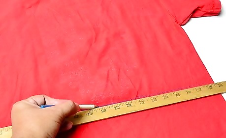 Draw a line across the front and back of the shirt. Spread the shirt on a flat surface. Use a straight edge to draw a line across it from side to side. Use the mark that you made earlier as a guide. Flip the shirt over, and draw another line on the back. This line will be the guideline for the elastic. Use a dressmaker's chalk for dark colored shirts and a dressmaker's pen for light colored shirts.