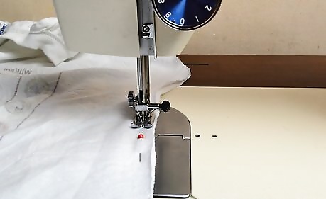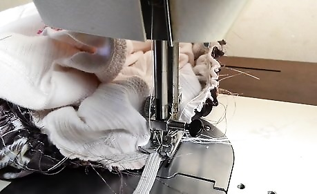 Continue sewing the elastic to the shirt, flatting the left seam as you go. When you reach the left side of the shirt, press the seam down against the fabric. Sew right across the seam. Keep the elastic pulled taut.
