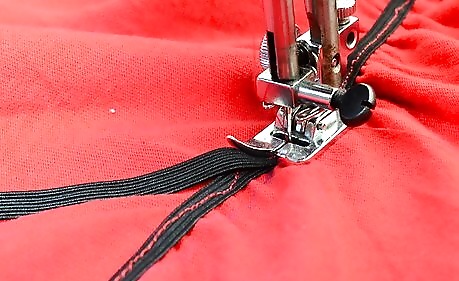 Begin sewing the elastic to the shirt. Clamp the foot and needle down over the shirt and elastic. Give the elastic a tug, stretching it out. Backstitch once, then sew forward using a narrow zigzag stitch. Keep the elastic pulled taut as you sew. The fabric will gather as you sew. Make sure that you are sewing the elastic over the line that you drew. Make sure that your thread color matches the shirt material.