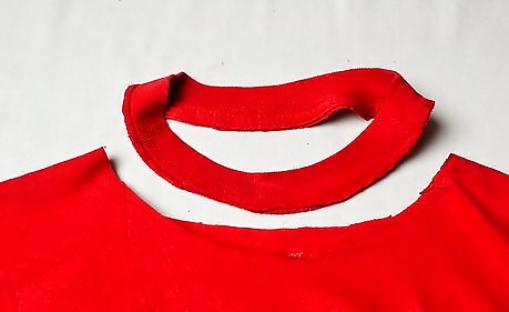 Consider modifying the collar. Most baggy T-shirts have a boring collar. Step things up by cutting the collar off first. Next, trim the front of the collar down into a V-neck or a scoop-neck. Fold the edges down by ½ inch (1.27 centimeters) and stitch them in place using a zigzag stitch. Alternatively, you can bind them with bias tape or extra ribbed/jersey fabric.