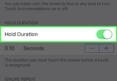 Slide the Hold Duration button right to the "On" position. With Hold Duration enabled, you have to briefly hold your finger down for a touch to register.