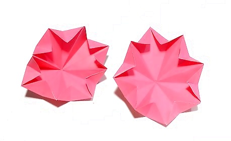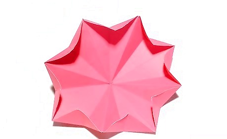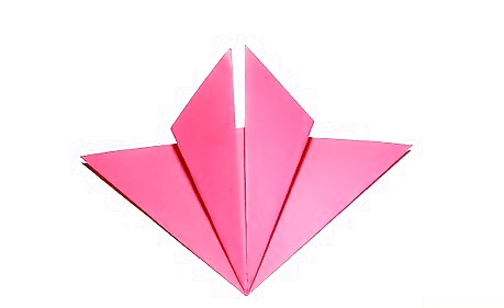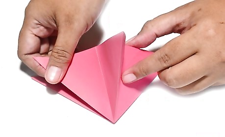Unfold two flaps so that you create a diamond shape. Unfold the two flaps in the back. Choose one flap and focus on this flap. Next, stick the finger in the middle of the flap and then push towards the center, flatten and move it back over. Repeat the same thing with the remaining three flaps. From the top, you should have four flaps on the left and four flaps on the right.