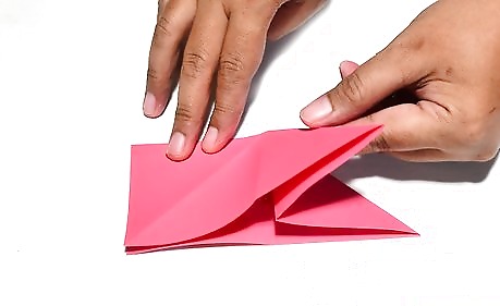 Rotate the paper to get the square on the right side and the right triangle on the left side. Focus on the top view of the paper and push inwards on the right side towards the center and flatten the paper.