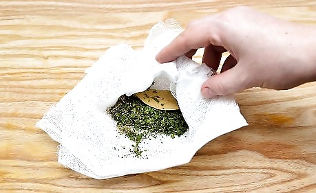 Wrap in a cheesecloth and tie with kitchen twine, again leaving some length for hauling in and out of the pot.
