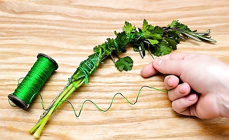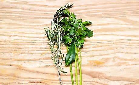 Gather together fresh herbs, making sure they have long stems. For a traditional bouquet garni, the herbs should consist of 3 sprigs of parsley, 2 sprigs of rosemary and 1 bay leaf.