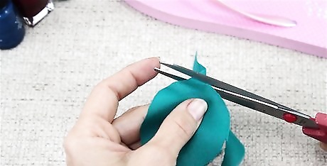 Cut the stem and backing off of a silk fake flower. Choose a fake flower that goes well with the color of your flip flops. Fake flowers have a plastic stem held on by a plastic backing. Cut and remove the plastic parts from the flower. If your flower has a plastic center, take that out too.