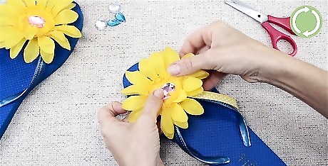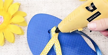 Glue the flower onto the center of your flip flop strap. Place a pea-sized dot of hot glue onto the center of the flip flop where the strap meets. Gently press your flower onto the dot of hot glue and hold it for 10 seconds. Let your flip flop dry for at least 1 hour before you wear them. Repeat the steps to create another flower for your second flip flop.