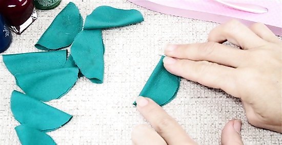Fold each cotton circle in half and glue it together. Place a pea-sized dot of hot glue on 1 side of the fabric circle. Fold the circle in half so that it sandwiches the hot glue. Hold the circle together for about 10 seconds so that the glue bonds. Repeat this for each of your 20 cotton circles, but do not fold the felt one. Put the glue on the side of the fabric that you want to cover up.