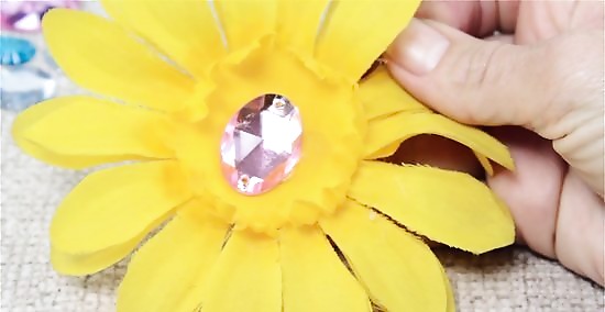 Press the flower onto the hot glue for 10 seconds. Line up the center of the flower with the hot glue. Press the flower gently onto the glue and hold it for about 10 seconds. Make sure the glue bonds with the flower before you let go.