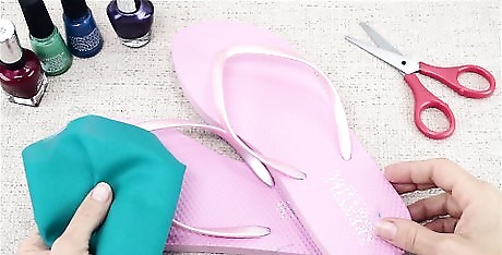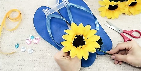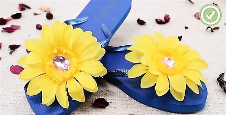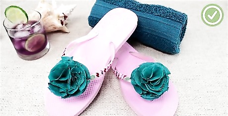 Flip flops are a great footwear for the summer and lounging at the pool. You can add a touch of flair and design to your flip flops by adding flowers and jewels. To make your own flower flip flops, choose between adding a fake flower or a fabric one, use hot glue to apply your flower, and wait at least 1 hour before wearing your flip flops so that the glue can dry.