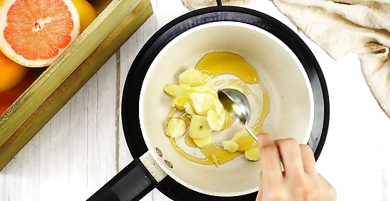 Turn off the burner and steep the mixture for 10 minutes. The ginger will continue to flavor the water as it sits and the water will cool. You can squeeze the citrus while you wait for the sweetened water mixture to finish steeping.