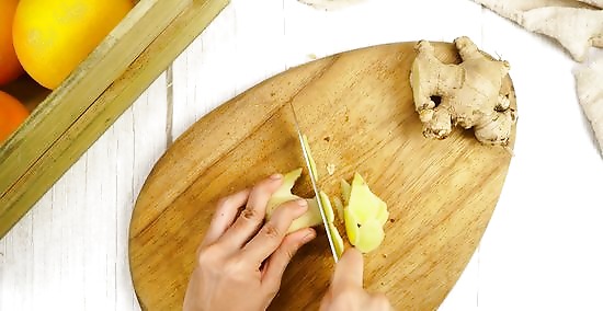Peel a 3 in (7.6 cm) piece of fresh ginger and thinly slice it. Use the edge of a metal spoon to scrape the thin peel off of the fresh ginger. Then, slice the ginger into ⁄4 inch (0.64 cm) thick pieces. If you like, you can leave the peel on the ginger, but your juice might not have as strong of a ginger flavor.