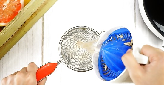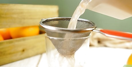Pour the juice through a fine-mesh strainer if you want thin juice. For a drink with more fiber and a fuller texture, drink the grapefruit juice as soon as you've squeezed it. If you prefer a thinner juice, set a fine-mesh strainer over a glass and slowly pour the juice through it. Discard the pulpy solids in the strainer.