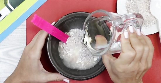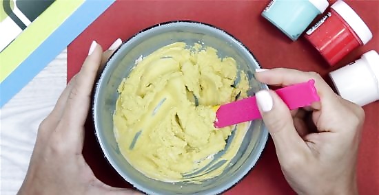 Add the plaster of Paris. Scoop 1/2 cup of plaster of Paris into each bowl. Stir thoroughly so that the mixtures are fully incorporated and free of lumps.