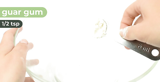 Stir the guar gum into the water until it dissolves. Pour 1 cup (240 mL) of warm water and 1/2 tsp (0.5 g) of guar gum into a large mixing bowl and whisk them together. Keep stirring until the guar gum is completely dissolved. Warm water from the tap is fine! It does not need to be boiling hot.