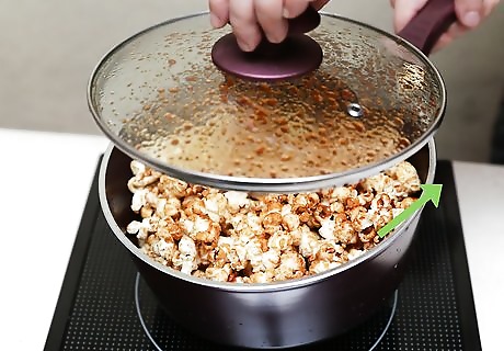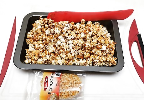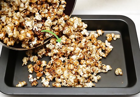Immediately pour the popcorn out on your baking sheet, spreading to cool. The hot pot's residual heat will cook and burn the popcorn if left in for too long. Sprinkle it out on the baking sheet and spread so that you only have one layer, helping the popcorn cool evenly. Spreading it out helps the popcorn dry as it cools instead of becoming soggy.