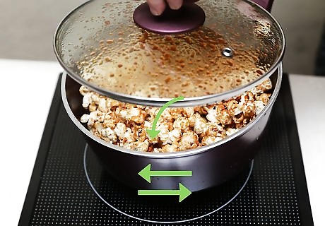 Shake the pan as the popcorn starts to pop, holding the lid on. Early on this should only be occasional -- every 15-20 seconds or so. Use a potholder to hold the lid down snugly without burning your hands.
