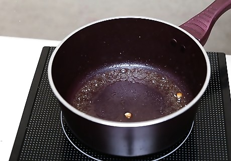 Warm the oil in a tall, lidded saucepan, adding three "test" kernels as it heats. Put the burner on medium-high heat and cover while it warms. Once one of these three kernels pops you'll be ready to make your popcorn.