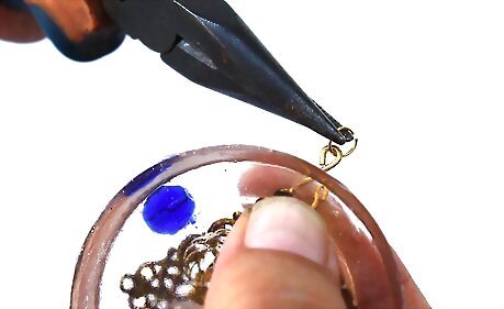 Add jump rings to the eye pins. Use the pliers to open a jump ring and slide the eye pin loop onto the jump ring. To open the jump ring, squeeze the pliers to close the jaws around the edges near the opening of the jump ring. Then, push one side of the ring away from you while you pull the other side of the ring towards you. Keep the jump ring open.