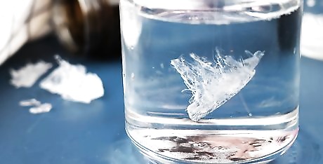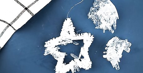 Make a snowflake. Tie several pipe cleaners or rough wires together in a star shape. Lower these into your salt solution, and watch small crystals coat the star and turn it into a sparkling snowflake.