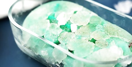 Create a crystal garden. Instead of making a single crystal, why not create a cupful? Make your salt solution, then pour over cut up sponges or charcoal briquettes in the base of the container. Stir in a little vinegar, and watch crystal formations grow overnight. Pour enough to saturate the sponges without submerging them. To make different colors of crystals, add a drop of food coloring to each sponge.