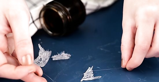 Cut the string the correct size to dangle in the water. Only the part of the string underneath the water will grow crystals. Cut it short enough to avoid touching the base of the jar, or the crystals might end up lumpy and small.
