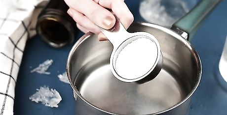 Stir in as much salt as you can. Take the pan off the heat. Pour in about ¼–½ cup (60–120mL) of your salt and stir until the water is clear. If you don't see any salt grains in the water, stir in another spoonful. Keep stirring in more salt until you see salt grains that won't dissolve when you stir. You've just made a supersaturated solution. This means the solution (the liquid) contains more salt than water can usually hold! When you heated the solution (your water), the molecules sped up, creating space between them that allowed more of the solute (your salt) to be absorbed than usual.