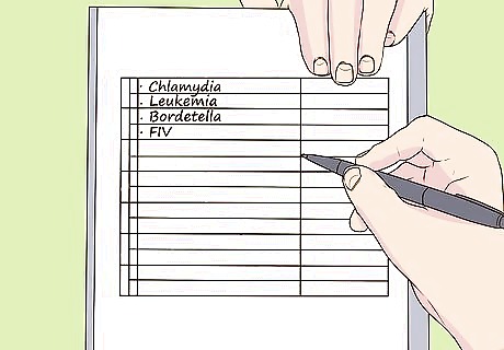 Mark down all core vaccines. These are the vaccines that all cats should get, unless their health prevents them from doing so. The vaccines for the Feline Panleukopenia Virus, Feline Viral Rhinotracheitis, Calicivirus and Panleukopenia (FVRCP, and Rabies virus will protect your cat from these more commonly spread illnesses. These vaccines are often suggested because the illnesses that they prevent can be life-threatening to cats. For example, a cat infected with rabies may suffer from brain swelling and hemorrhaging, resulting in death.