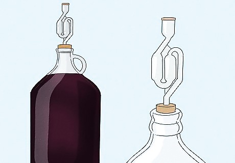 Strain and siphon the liquid. When the bubbling slows down, about 3 days after it begins, it's time to strain out the solids and siphon the liquid into your carboy for longer-term storage. Once you've siphoned it into the carboy, affix the airlock to the opening to allow for the release of gas while preventing oxygen from coming in and spoiling your wine. If you don't have an airlock, you can use a small balloon placed over the opening with about 5 pin sized holes in it. Secure it with tape. This will let the gas escape but not let in oxygen.