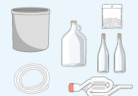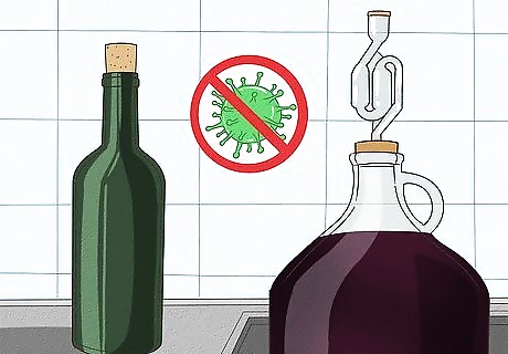 Gather supplies. In addition to the wine ingredients, you'll need a few basic supplies to ensure that your wine can age without being affected by bugs or bacteria. Home winemaking shouldn't be expensive, so it's not necessary to splurge on special equipment. You will need the following supplies: A 2 gallon (7.6 L) crock or glass jar (you can often find these at vintage or secondhand stores, however, be advised that many used crocks may have been used for sauerkraut or pickles and could contaminate your wine. A 1 gallon (3.8 L) carboy (a glass container with a small neck) An airlock A thin plastic tube to be used for siphoning Clean wine bottles with corks or screw caps Campden tablets (optional)