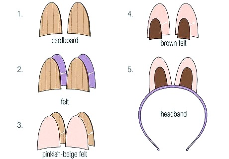 Make easy no-sew ears out of cardboard, felt, and a headband. Trace the shape of the Labubu's ears (like a short rabbit ear) onto cardboard and cut them out. On the back of the ears, use hot glue to attach felt in a color that matches your costume. Cover the front of the ears with pinkish-beige felt, and use a smaller piece of brown felt for the center of the ears. Then, hot glue the ears to the very top of a headband. The Labubu’s ears should point up and slightly inward. When you draw the ears onto the cardboard, leave a little extra on the bottom so you’ll have room to glue the ears to the headband. To make the headband more subtle, wrap it in felt that matches your costume before you attach the ears. For a more realistic look, use Sherpa fleece instead of felt—just note that it can be a little harder to attach with glue.