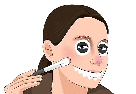 Draw on a Labubu face if you’re good with makeup. To do your own Labubu-style makeup, outline a vertical oval shape in black beneath your eyes, then fill it in with white. Draw a thin, curved smile extending from either corner of your mouth, then draw 9 triangle shapes for the teeth and fill them in with white. Add soft blush high on your cheeks and draw the Labubu’s nose on the tip of your nose. To mimic a Labubu’s signature mischievous brow, cover your brows with concealer or powder. For an easier way to make Labubu teeth, cut out 9 triangles from white paper or cardstock, then attach them to a thin black string. Attach the string to your face with eyelash glue or another skin-safe adhesive.