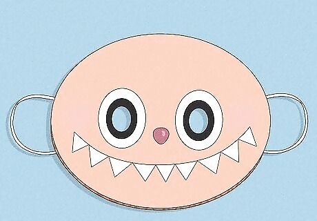Make a Labubu mask out of cardboard for an easy option. Cut out a large horizontal oval from cardboard. Cover the cardboard with peach-colored felt to mimic a Labubu’s vinyl skin. Then, cut out white ovals with smaller black ovals in the center for eyes, and draw on a small nose, wide smile, and 9 pointed teeth. Dab a bit of pink paint or blush onto the cheeks. Use felt, paper, or cardstock to cut out the eyes. Glue a craft stick to the back of the mask so you can hold it up in front of your face. If you don’t want to make separate ears, add ears to the top of your mask before you cut it out. You can also use foam instead of cardboard—this will create a sturdy but lightweight mask.