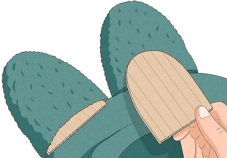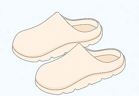 Wear beige shoes to mimic Labubu’s feet. The hands and feet on Labubus are the same color as their faces. A simple pair of beige slip-in shoes is enough to create the effect, but if you want to make it more elaborate, attach three pointed toes made of craft foam to the tips of the shoes. You can also wear beige, four-fingered gloves if you’d like—Labubus have a thumb and 3 fingers—but you can just leave your hands bare if you prefer.
