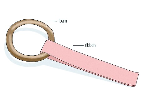 Make a keychain tag out of ribbon and foam. To create Labubu’s signature pendant, make a hoop shape out of a tube of craft foam, then spray paint it silver or gold. Loop a long piece of fabric through the keychain circle, then sew, glue, or pin the ends of the fabric to the back of the costume. Add branding to make it look more authentic: On most Labubus, the keychain tag says “THE MONSTERS” on one side of the fabric and “POP MART” on the other.