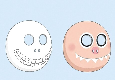 Create a Labubu mask out of papier-mache if you’re crafty. Get a large, circle-shaped mask like Barrel or Jack Skellington from Nightmare Before Christmas. Cover the mask with masking tape, then papier-mache over that, building up the brow bones and shaping the pointed teeth as you go. Once the papier-mache is dry, paint the mask so the face is a peachy beige, the eyes are white with black centers, the nose and smile are black, and the teeth are white. Add subtle pink blush to the cheeks. Some Labubus have freckles, so feel free to add those if you’d like. If the eyes of the original mask are perfectly round, consider reshaping them into vertical ovals so they look more like Labubu’s. If the eye holes aren’t covered, add a piece of black mesh to the back of the mask so you can see through the mask, but others won’t be able to see your eyes.