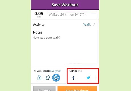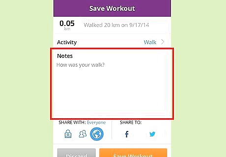 Record some notes, or something to share with your MapMyWalk and/or social networking friends (such as those on Facebook). Type your notes in the "Notes" section, which, by default holds the default text "How was your workout?".
