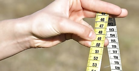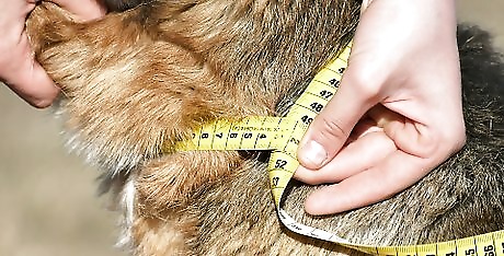 Wrap a soft measuring tape around the base of your dog’s neck. Take a long, flexible measuring tape and loop it around your dog’s neck directly above the shoulder blades. If you aren’t sure where to measure, arrange the tape 3 to 5 in (7.6 to 12.7 cm) beneath your dog’s jaw line. The measuring tape in many sewing kits works well for this. If you don’t have a soft measuring tape on hand, use a long piece of string or yarn instead.