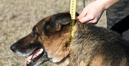 Measure around the base of your dog’s skull for a specialty collar. Loop your measuring tape around the top of your dog’s neck, arranging it just below the jaw line. Create a snug loop with the tape, then take note of the final measurement. If you’re getting a specialty brand collar, like a Martingale or Tag accessory, you might need to factor in this measurement before making a purchase. These types of collars are specifically designed to fit over the middle of your dogs neck, instead of the base. Getting 2 measurements along your dog’s neck help to ensure that the collar fits comfortably. Types of Specialty Collars Martingale collars have an extra loop cinch in the front, and provide extra support for dogs with thicker necks and small heads, like Greyhounds. Head collars go around the muzzle, and are good for large, rambunctious dogs like Golden Retrievers that tend to pull on the leash. Ask a pet supply store associate for help to get an accurate measurement for this kind of collar. Prong collars fit snugly around the middle of your dog’s neck, and deter your pet from pulling too much. If you’re purchasing this kind of collar, use the initial measurement of your dog’s neck without the extra 1 to 2 in (2.5 to 5.1 cm) added.
