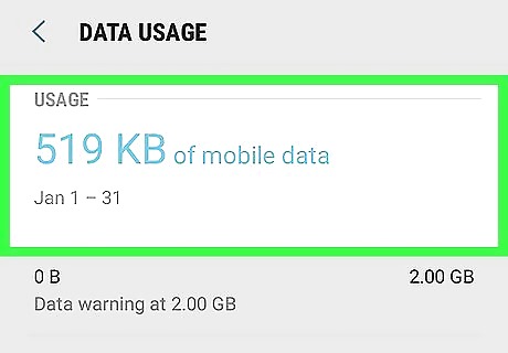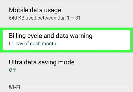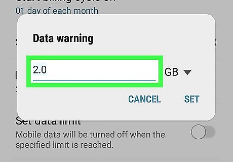 Open your data warning settings. The steps to do this vary by Android, but here are some common locations: Samsung Galaxy: Tap Billing cycle and data warning. Other Androids: Tap Mobile data usage, tap the gear icon, and then tap Data warning.