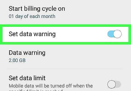 Slide the "Set Data warning" switch to the On position Android 7 Switch On. Turning this switch on allows you to create an alert that informs you when you're close to reaching a certain amount of data. If you see a warning message about data limits, tap OK to continue.